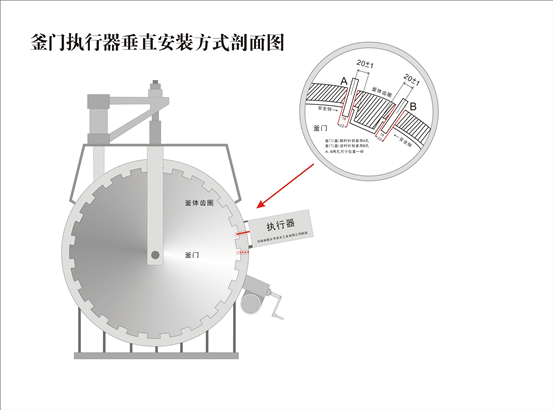 2.3.2.將壓力容器的快開門裝置關好,使其處于鎖緊閉合到位,確認鎖緊及開啟方向,按《安全聯(lián)鎖裝置安裝圖》規(guī)定,在外齒圈鎖緊時的前進方向,距殼體內齒圈前端20±1mm在齒圈上畫安全銷孔橫中心線,兩點交叉處為銷孔圓心。